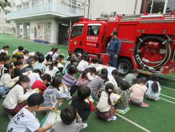 小石川消防署の方が来て、消防署の仕事の話やポンプ車の詳しい説明を聞きました。消防署の仕事は交代制で、どんなときも出動できるように待機していることなどを聞き、私たちの生活はいろいろな人に支えられていることを知りました。