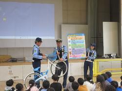 大塚警察署の方に自転車の乗り方、運転前の点検の仕方についてのお話を聞きました。代表児童が、実際に体育館に作ったコースを自転車で走り、どのようなことに気を付けて運転するかも学習しました。受講後、「交通セーフティー検定認定証」をもらいました。