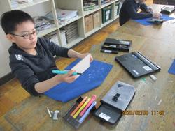 6年生は図工の学習で、フォトフレーム作りをしています。「6年間の思い出を残す写真立てを作ろう」というめあてから、彫刻刀や絵の具を用いて、各々が工夫を凝らしながらフォトフレームを作成中です。