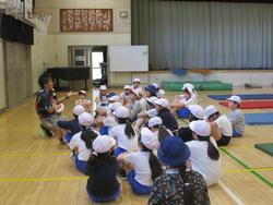 5年生を対象にハンドボール教室が行われました。指導員のダイナミックな試技に興味津々。ルールやシュートの練習をし、ミニゲームを行いました。すぐにボールに反応し、楽しく汗を流しました。