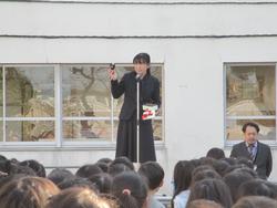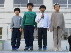 式の後、全国学校書初中央展の表彰を行いました。代表児童が表彰状を受け取りました。校庭には全校児童からの拍手が響き渡りました。