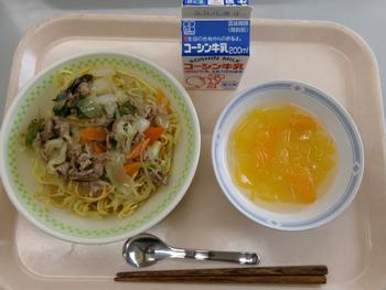 塩あんかけ焼きそば オレンジ寒天 牛乳 |