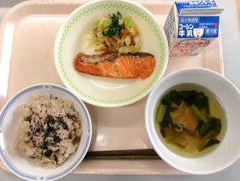 お赤飯 鮭の照り焼き 青菜とツナの和え物 お祝いすまし汁 牛乳 |