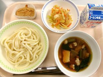けんちんうどん 糸寒天サラダ 米粉ときな粉の豆乳マフィン 牛乳 |