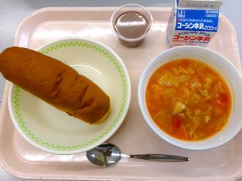 焼きカレーパン ミネストローネ ココアプリン 牛乳 |