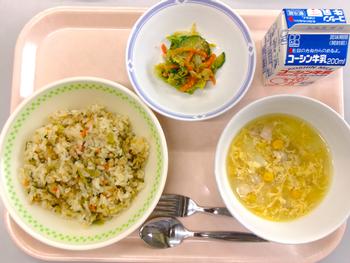 高菜チャーハン 中華風コーンスープ ごまドレサラダ 牛乳 |