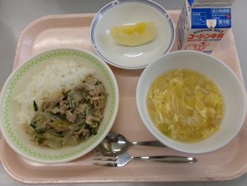 ねぎ豚塩だれ丼 白菜と卵のスープ りんご 牛乳 |
