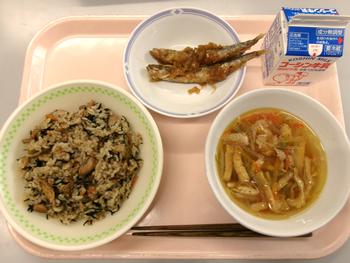ひじきご飯 ししゃもの南蛮漬け 沢煮碗 牛乳 |