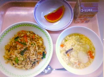 ビビンバチャーハン トックと卵のスープ オレンジ 牛乳 |