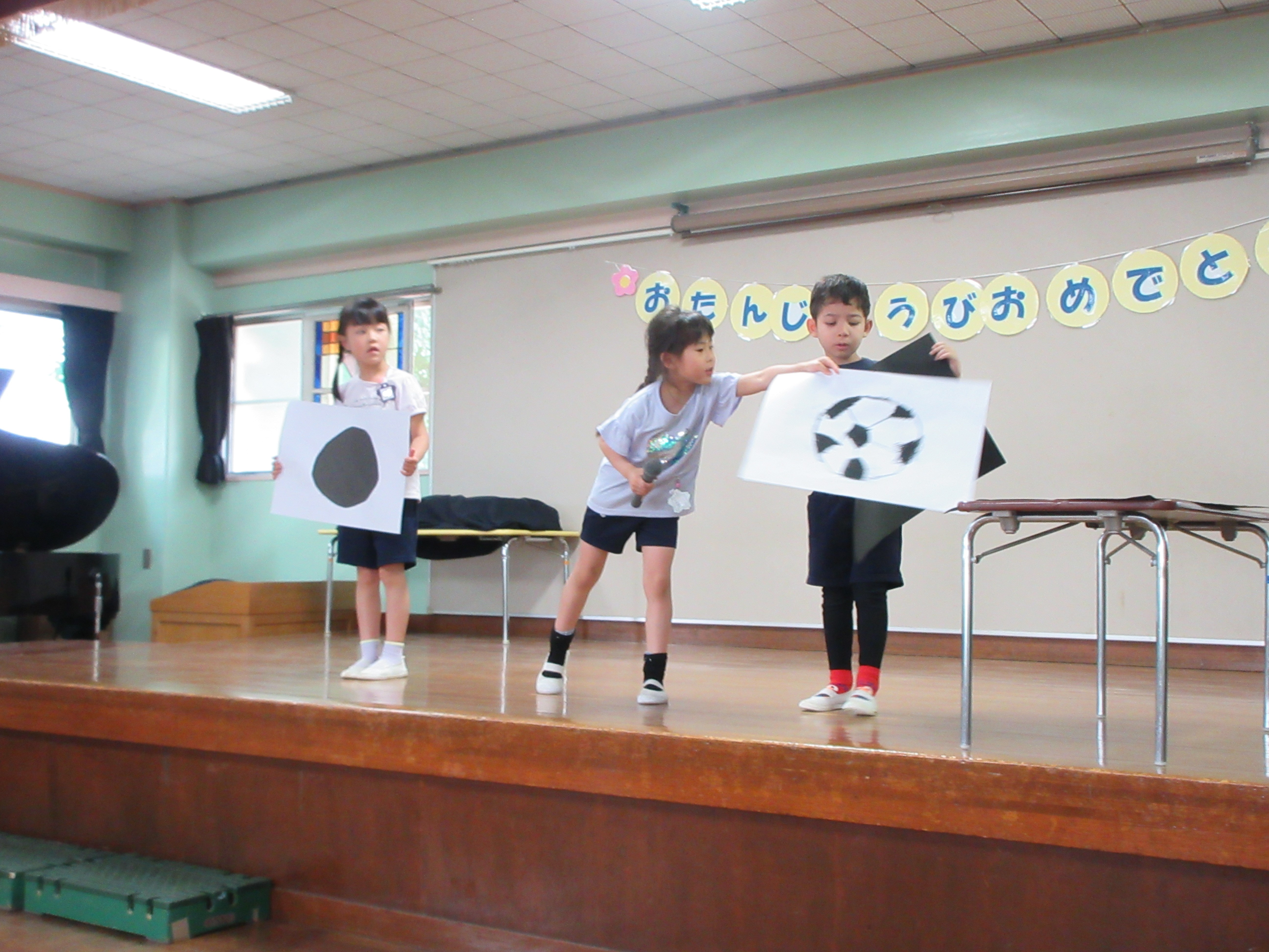 年長組は、グループの友達と「3ヒントクイズ」(ヒントを3つ聞いて、答えが何かを当てるクイズ)を考え、誕生会のお楽しみの出し物として披露しました。