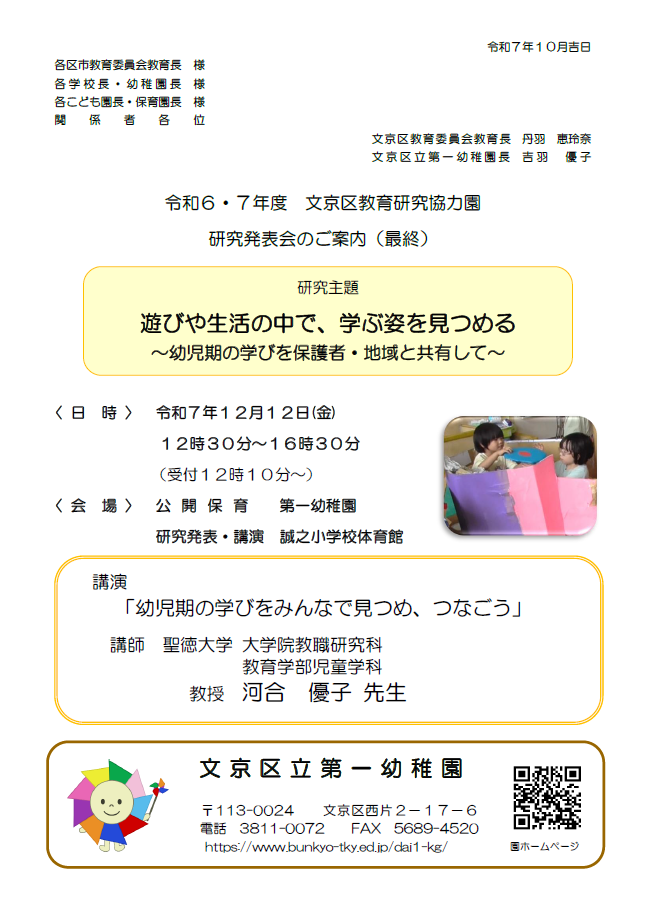 令和6・7年度文京区教育委員会 教育研究協力園 研究発表を12月12日(金)に行います。
