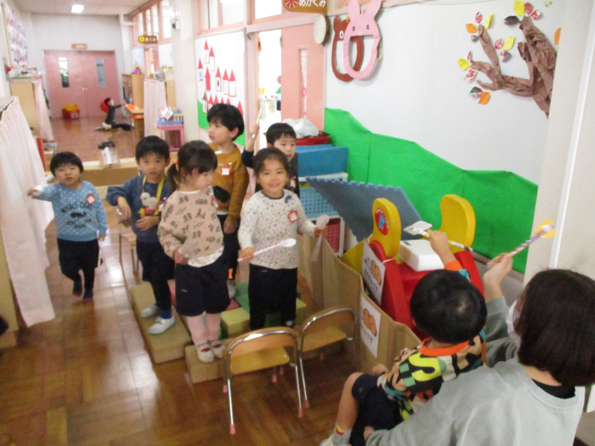 好きな遊びで、ドングリを入れて作った手作りのマラカスを持ったり、お客さんへのお土産を持ったりして、音楽会ごっこを楽しんできました。「タイコも作りたい」「ギターもあるといいんじゃない?」と思い付いたことを話し、楽器を増やして楽しむ姿もありました。