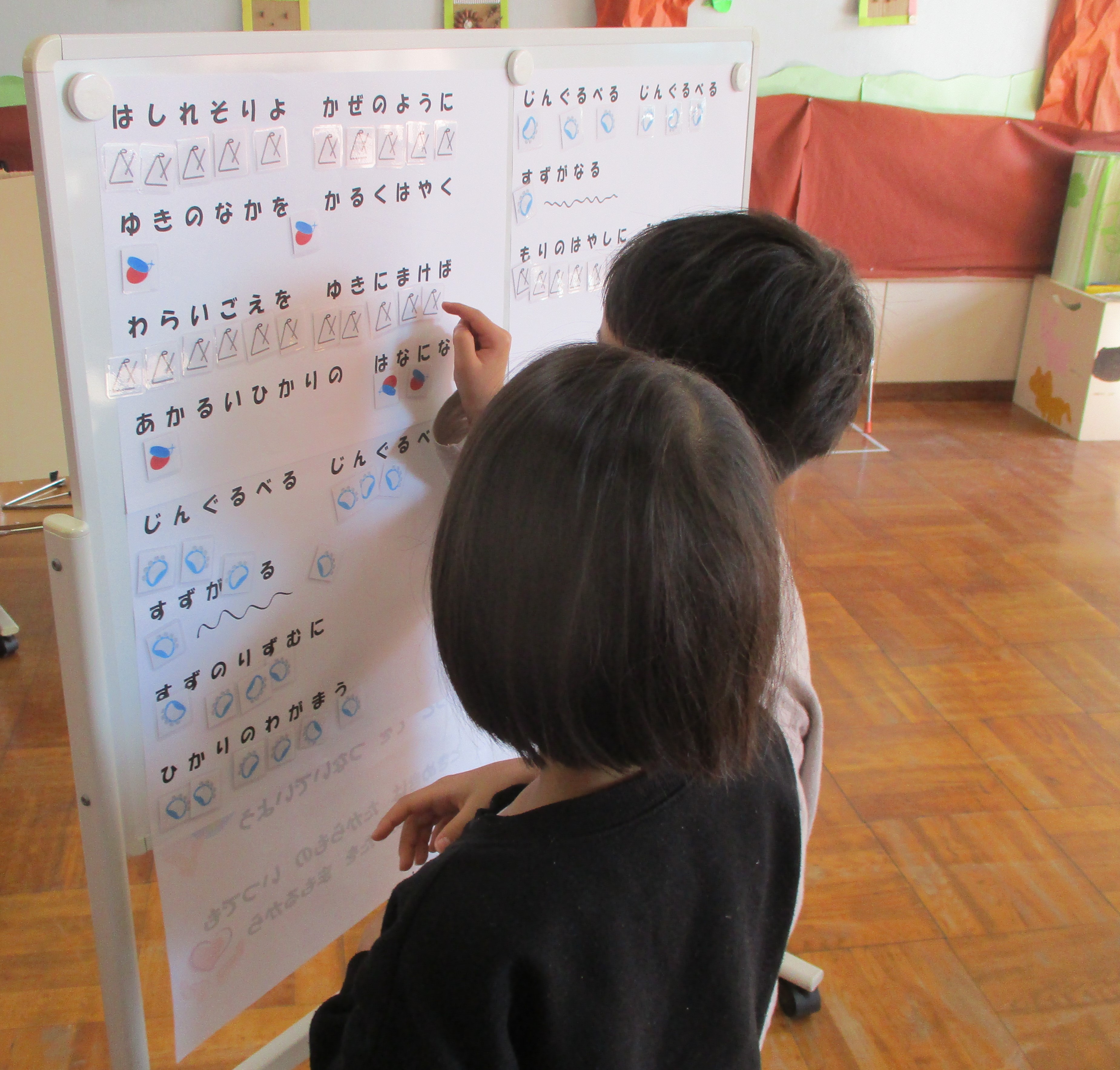 年長組の子どもたちは本当に歌が大好き!年長になり、いろいろな歌を歌えるようになりました。音楽会では「あおいそらにえをかこう」と「せかいがひとつになるまで」を歌いましたが、年少・中の頃に比べ、一曲が長くなったり、メロディーが難しくなったり、何より歌詞が抽象的なものになっていましたが、子どもたちは見事なまでに歌詞の表していることを読み取り、曲想を感じ取り、表現してくれました。聴いてくださった皆様の心に子どもたちの歌に込めた想いが届いたのではないか、と思います。