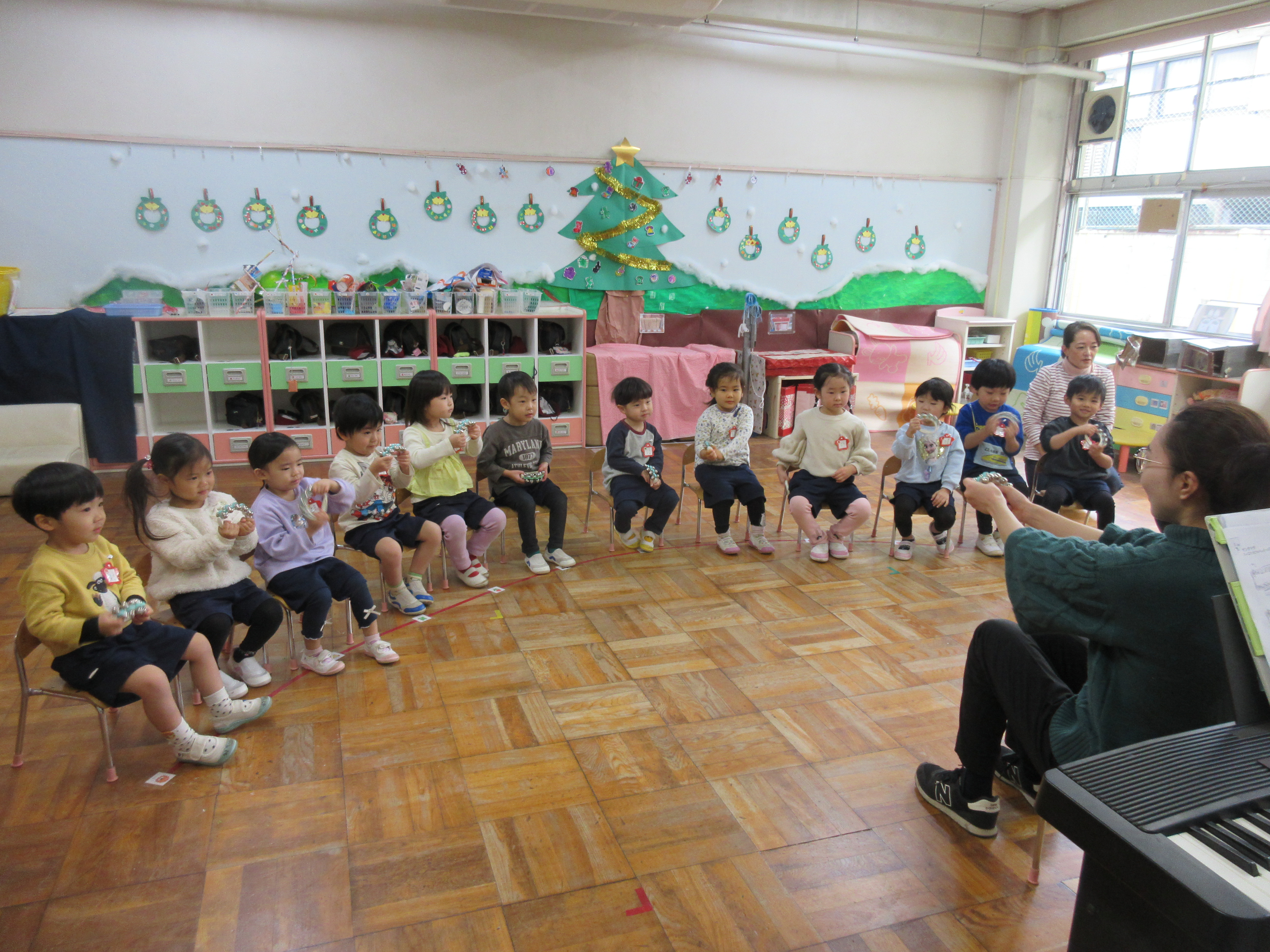 合奏では、「クリスマススペシャルメドレー」を演奏しました。始めの頃、子どもたち同士で楽器を鳴らしながら、「ここをこうするのはどう?」「え、でもここは静かな感じがいいからスズとトライアングルにしようよ」などとこれまでの感じ取った曲想や親しんできた楽器の音色をもとに鳴らし方を相談していきました。鳴らし方が決まってからはいろいろな楽器を経験できるように交代しながら取り組んだこともあってか、自分の楽器以外の鳴らし方もよく覚えていました。タンバリンやトライアングルを演奏する人が、「たのしいウィンターワンダーラーンド♪、ドォォォン」と、大太鼓やシンバルの音を口で再現する姿もあり、互いの音をよく聞き合って演奏していたことが分かります。さらに、本番を迎える前には、年中さんや他の学年の先生にも聴いてもらう機会がありました。感想を伝え合ったことで、「感想をもらえるのがうれしい」「また聴いてもらいたい」と自分たちの演奏を聴いてもらうことにも喜びを感じていました。
