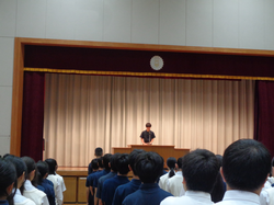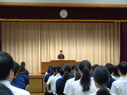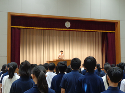 生徒会朝礼 今週は、生徒会朝礼からスタートしました。 最初に、各学年の学級委員から「学習の継続的な努力の必要性」や「普段の学校生活における課題」などのお話がありました。続いて、10月の学習発表会のスローガンが発表され、「三原色~創ろう!努力の華~」に決まりました。学習発表会の実行委員長からは、「それぞれの色を出し、実りのある学習発表会になってほしいという願いが込められている」とお話がありました。最後に、美化コンクールの表彰と水泳の表彰、先週から活動している教育実習生の紹介がありました。 今週末には定期考査2がありますが、その後も様々な行事が予定されています。一人ひとりが計画性を持って、日々の生活に取り組みましょう。 (9/22 9:47 更新) |