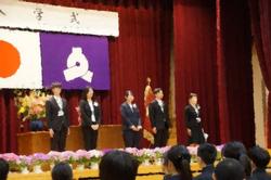 第80回入学式が行われ、98名の新入生が六中の門をくぐりました。担任の先生の呼名に元気な返事で応えた新入生は、とても立派な姿勢で式に臨みました。2・3年生の先輩たちも素敵な装飾やメッセージで出迎えてくれ、式中では素晴らしい歌声での校歌を披露してくれました。