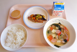 2月4日は立春です。暦の上では春の始まりの日になります。そこで給食でも春を感じられる色合いのメニューを用意しました。汁ものには梅の花の形のかまぼこを使っています。
