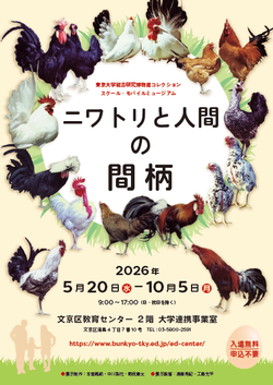 「新しいニワトリが欲しい」そう思い続けた人間は、さまざまなニワトリを育種してつくり上げた。今日、何百種類ものニワトリが全世界で飼育されている。肉として食べるためのニワトリ。卵を取るためのニワトリ。それだけではない。姿を観賞するためのニワトリ。鳴き声を楽しむためのニワトリ。闘わせて見るニワトリ。つまりは、人間は食料を得るためだけでなく、心の潤いを求めて、ニワトリを伴侶として飼い、娯楽の友として育ててきたのだ。そんなニワトリたちを標本で見る機会をつくろう。 開場時間:9時から17時 休館日 :日曜,祝日 入場料 :無料 |