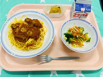 牛乳・シーフードトマトスパゲッティ・カレードレッシングサラダ・スイートポテト
