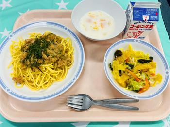 牛乳・練馬大根スパゲッティ・パリパリサラダ・ヨーグルトポンチ