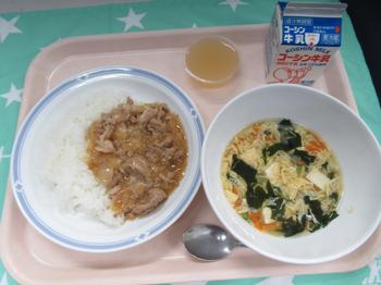 牛乳・新玉葱と豚肉の生姜焼き丼・かきたま汁・桃かんてん
