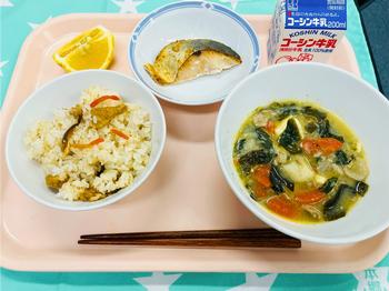 江戸東京野菜 千住ねぎ 牛乳・れんこんのきんぴらごはん・スズキの香味揚げ・根深汁・果物(はるみ) 千住ねぎは、江戸東京野菜の一つです。 江戸時代、江東区の砂村から千住に伝わった根深ネギで、甘くてやわらかいのが特徴です。 きょうは、千住ねぎをたっぷり使って、体の温まる根深汁を作りました。 教室では、千住ねぎのクイズをしました。ねぎの甘さを味わって食べる様子が見られました。 |