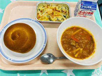 図書委員会コラボ給食 牛乳・黒砂糖パン・こまったさんのポテトグラタン・トマトスープ きょうは、図書委員会とのコラボ給食です。 『こまったさんのグラタン』(寺村輝夫 作・岡本颯子 絵)に出てくる描写を参考にして、ポテトグラタンを作りました。薄切りにしたじゃがいもを蒸して、手作りのホワイトソースと合わせ、1つ1つグラタン皿に流してオーブンで焼きました。 教室では、こまったさんの物語についてクイズをしました。「本を読んだことがある!」と報告してくれる児童が多かったです。給食室前に本の掲示もしました。 |