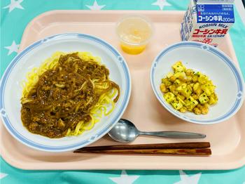 サイダー寒天 牛乳・ジャージャー麺・青のりビーンズポテト・サイダー寒天 本郷小学校のサイダー寒天は、サイダーの炭酸が残るように工夫してつくっています。 ・寒天液は少し冷ましておく。 ・サイダーは炭酸が抜けないように少量ずついれる。 ことがポイントです。 シュワシュワと甘くて、子どもたちから人気のデザートとなっており、多くのクラスの食缶が空になっていました。