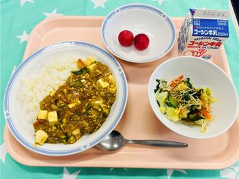 豆腐 牛乳・豆腐の和風カレー煮丼・じゃこ入りわかめサラダ・果物(ぶどう・クイーンニーナ) 今日は、たっぷりの豆腐を煮て和風カレー味に仕上げたどんぶりを作りました。 豆腐は煮崩れないように、一度下茹ですることがポイントです。 スパイシーな香りが食欲をそそる豆腐のカレー煮は、とろっとしていてご飯によく合います。