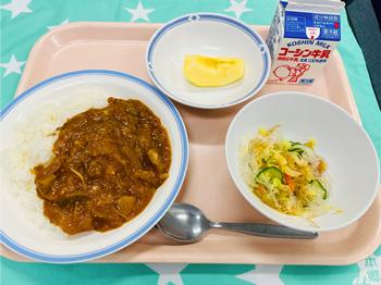 都市農業の日 牛乳・地場産野菜入りカレーライス・海藻サラダ 柚子入りドレッシング・果物(柿) 11月2日は「都市農業の日」です。「都市農業」とは、人口が多い都市部で行われている農業のことをいいます。 きょうは、東京都内からとどいた農作物(さといも、さつまいも、バターナッツかぼちゃ)を使って、カレーライスを作りました。おいしさを引き出すために、それぞれ素揚げしてから、カレーの仕上げに加えました。 教室では、動画で都市農業についての学習もしました。生産者を身近に感じ、感謝の気持ちをもって食べるきっかけになれば、うれしく思います。  |
