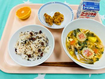 開校記念日 牛乳・赤飯・鶏肉の唐揚げ・赤だしみそ汁・果物(みかん) 明日10月17日は、本郷小学校の開校27周年記念日です。 きょうは、朝一番でささげをゆで、そのゆで汁を使って赤飯を炊きました。 また、児童から大人気の唐揚げや、「祝」のなるとを入れた汁物を組み合わせ、献立全体でお祝いの気持ちを表現しました。 教室では、「赤飯に入っている豆は何でしょうクイズ」をして、あずきとささげの違いについて知らせました。  |
