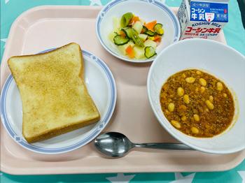 4月20日(月)スナップエンドウ 牛乳・セサミトースト・チリコンカン・スナップエンドウ入りポテトサラダ