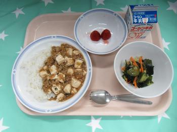 4月16日(木)豆腐 牛乳・麻婆豆腐丼・わかめサラダ・いちご どこの学校にいっても好きな献立の中に入る 麻婆豆腐。 今日もみんなたくさん食べてくれました。 給食クイズは、使用した豆腐の重さ。 71㎏と聞いて 高学年はへーといっていました。 1年生は学校探検をした後、配膳もがんばりました。