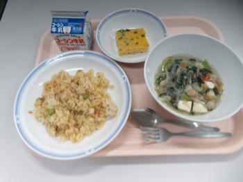 4月14日(火)グリンピース 牛乳・ひすいチャーハン・中華風たまご焼き・春雨スープ グリンピースの緑色が鮮やかなチャーハンです。 今日のグリンピースは鹿児島産です。 初夏の香りを運んでくれました。 苦手な方も多い食材ですが、目の前にあることが大切です。 今日の給食クイズは、卵焼きで使った卵の数でした。 答えは 1050個です。 給食室で1つ1つ割ってから調理しました。