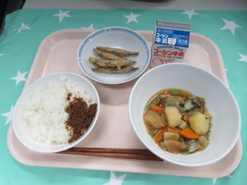 4月15日(水)かみかみ献立 牛乳・玄米ごはん・かつおでんぶのふりかけ・きびなごのから揚げ 肉じゃが煮 玄米ごはんにカツオのふりかけ。きびなごもカラリと揚がりました。 今日は、よくかんで食べることに挑戦する カミカミ献立です。 人生100年時代。しっかり食べて健康でいましょう。