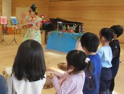5月のお楽しみでは、年中さくら組が『ことりのうた』を、年長すみれ組が『ジグザグおさんぽ』の2番と3番を歌いました。また、年少ちゅうりっぷ組は、教師が演じる『わたしのワンピース』のパネルシアターを楽しみました。
