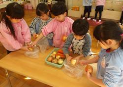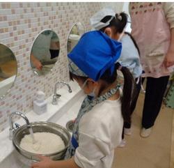 前日には、年長すみれ組がもち米とぎを行い、その様子を年中さくら組が見に来ました。