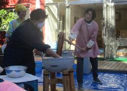 蒸しあがったお米を試食しました。もち米の香りが広がり、「いいにおい」、「おもちのにおいがする」と歓声を上げる姿が見られました。その後は1人ずつ杵を持ち、もちをつきました。もちつきが始まると、「よいしょ!」、「頑張って!」という掛け声が聞こえ、にぎやかで笑顔あふれる会となりました。