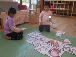 正月遊びの会では、お家の方や友達、先生と一緒に、ポックリやコマ回し、すごろく、カードゲーム、羽根突きなど、正月ならではの遊びを楽しみました。