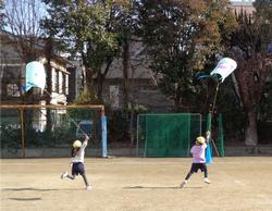 中学生のお兄さんお姉さん、本駒込保育園、本駒込南保育園、本駒込西保育園の友達と一緒に凧揚げ交流会を行いました。