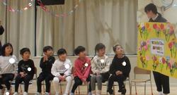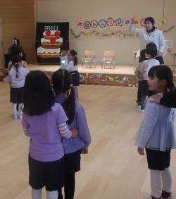 誕生会のお楽しみでは、教師が演じる「まんまるちゃんクイズ」をしました。