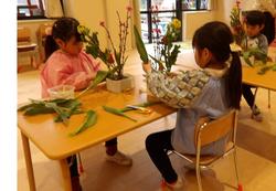年長すみれ組は、モモ、チューリップ、ナノハナを生けました。生ける花の正面を確認し、角度や高さのバランスを考えながら水切りを行うなど、工夫しながら生け花を楽しむ姿が見られました。