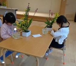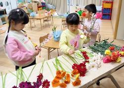 年少ちゅうりっぷ組は、ネコヤナギ、ミモザ、ストックを生けました。子どもたちは、花を見て「きれい」「ふわふわしている」などとつぶやき、わくわくした様子で、思い思いに生け花を楽しみました。
