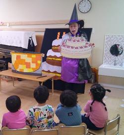 年中さくら組と年長すみれ組は、誕生会のお楽しみとして本駒込図書館の方に大型絵本『よかったねネッドくん』(レミーシャーリップ作、偕成社)と『おしゃれなおたまじゃくし』(さくらともこ作、PHP研究所)の読み聞かせをしていただきました。年少ちゅうりっぷ組は教師が演じる『キャベツの中から』のミニシアターでお誕生日のお祝いを楽しみました。