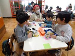 帰園後は、幼稚園のホールで年中さくら組と年長すみれ組一緒に弁当を食べました。