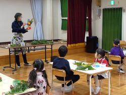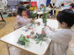 また、園内のカポックの葉は、年長すみれ組が入園した頃から子どもたちの姿を見守ってきた葉であると園長先生から話がありました。子どもたちは、これまでのわくわく生け花で教えていただいたことを振り返りながら花を大切に扱い、生けました。