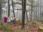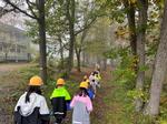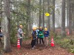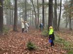 霧の中、学園の敷地内の森で、ディスクゴルフを楽しんでいます。5~6人のグループで、12ホール回ります。ディスクを投げて木に設置されているフラフープに入れるという簡単なゲームですが、ディスクが曲がったり戻ったりして思うように飛ばないので、前に進めるのに苦心しています。少々寒いのですが、仲良く楽しくゲームをしています。