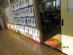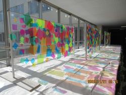 2年の共同作品です。体育館入口の6年3組教室の前に展示されています。窓から陽が差し込む10時ころまでの限定の世界です。