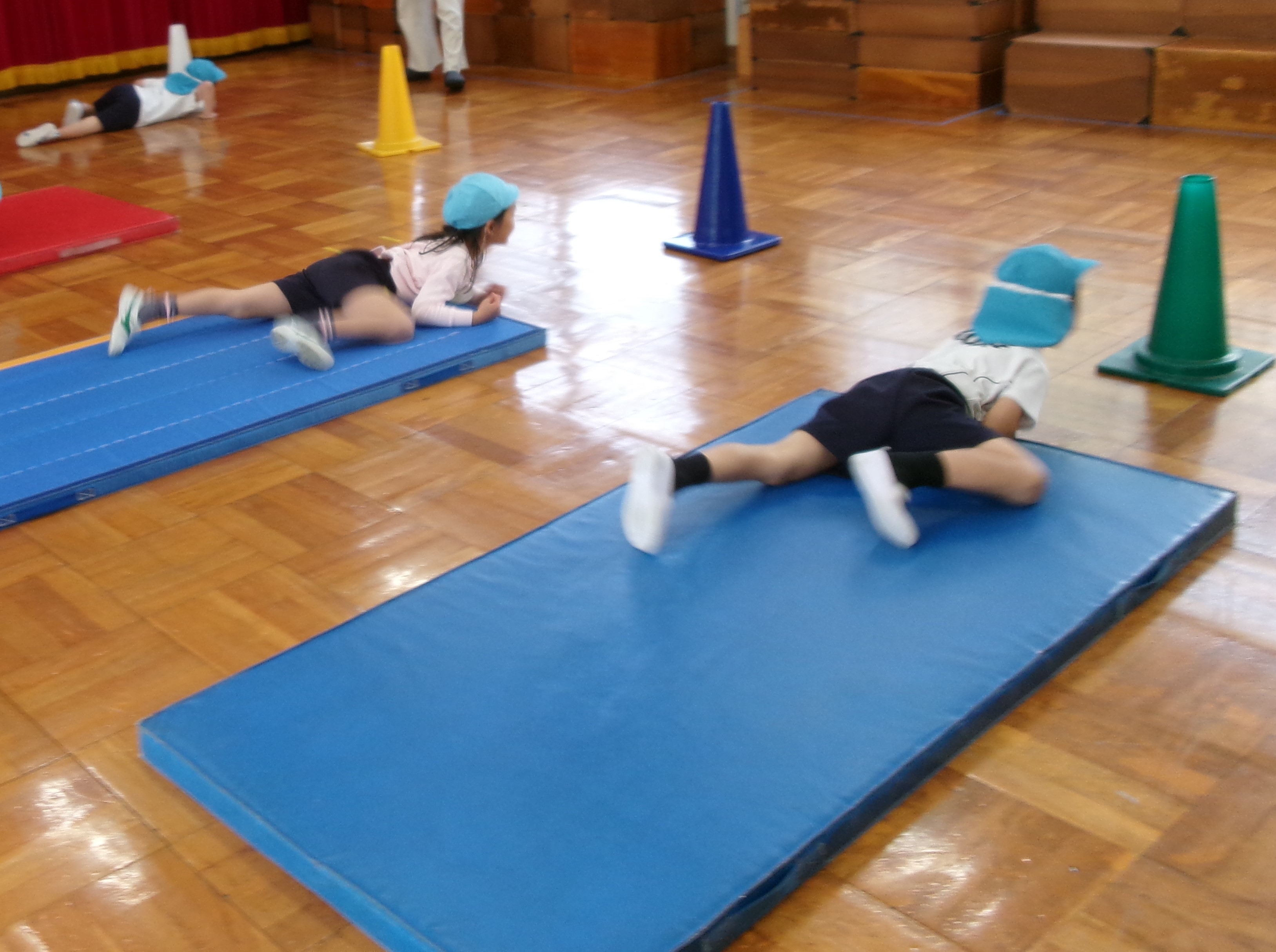 簡単な動きが中心の運動ですが、「クローリング」や「ラディアン」、「ジャングル鬼ごっこ」など身体全体をバランスよく使う活動内容で、子どもたちは小田先生のまねをしながら、楽しく身体を動かしました。