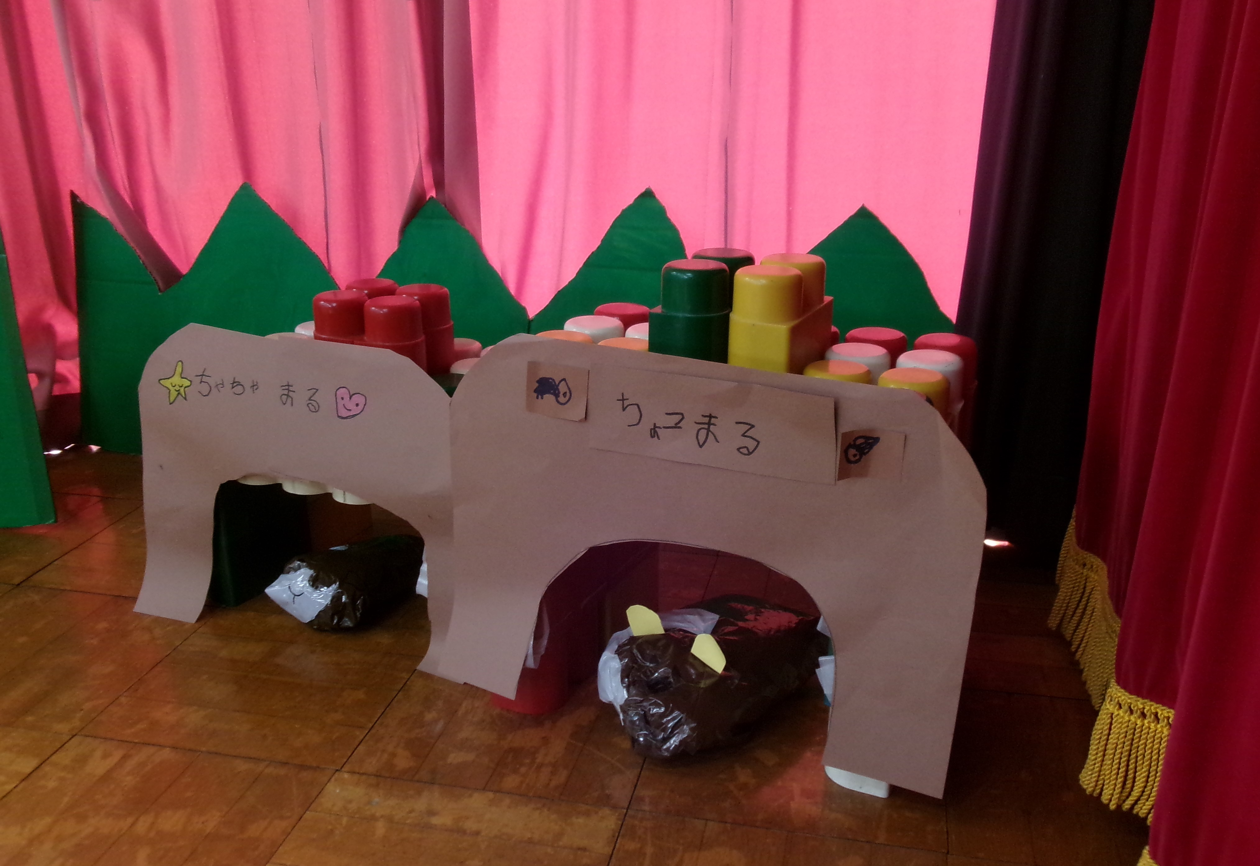 年少もも組には秘密で作っていたため、招待されたもも組はビックリ。「あお組さんが作ったの?」「本当に乗れるんだって、すごいね!」と驚きながら、あお組の遊園地を楽しんでいました。
